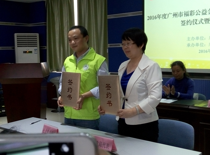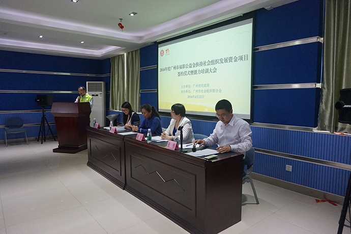 4月22日下午,2016年度广州市福利彩票公益金扶持社会组织发展资金项目签约仪式暨能力培训大会在广州市社会组织培育基地举行,广州市社会组织管理局副局长胡凌、广州市社会组织联合会秘书长张伟等出席了签约活动。本次活动由广州市民政局主办,广州市社会组织联合会承办, 草根助学会应邀出席项目签约仪式并介绍经验。