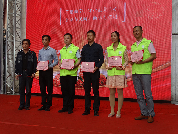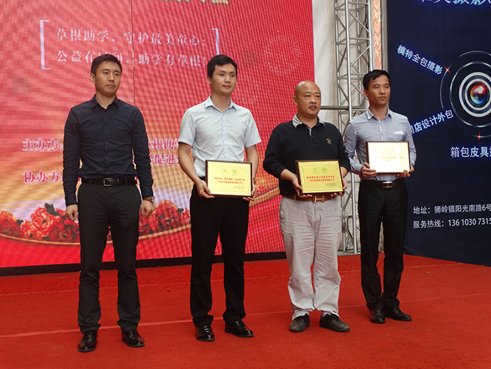 草根助学会负责人李兆洲(左一)向赞助支持单位颁发感谢铭牌