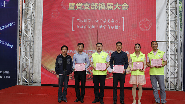 草根助学会上一任党支部书记黎小东、嘉宾代表徐荣满向草根助学会继任党支部书记刘燕娜移交支部旗牌