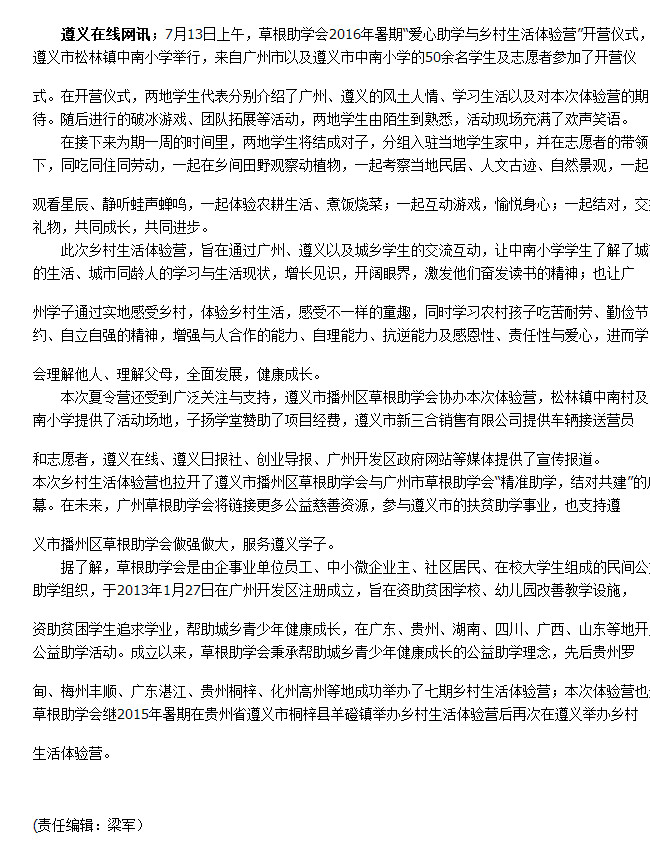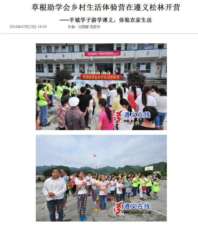 广州开发区政府网站报道,草根助学会乡村生活体验营在遵义松林开营