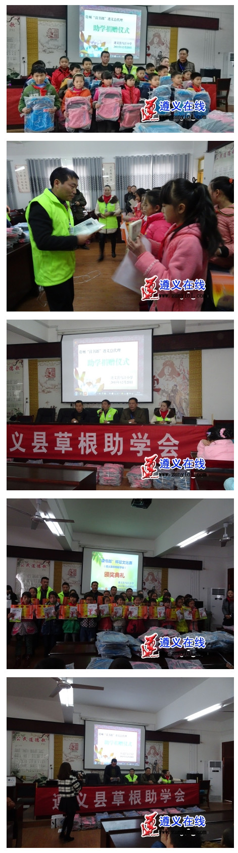 遵义在线网讯:12月29日,草根助学会“读书郎”杯征文颁奖仪式在遵义县乌江小学举行,遵义县宣传部外宣中心主任丁思江,遵义县党政办秘书陈金太,贵州读书郎遵义总代理经理赵清松、遵义县草根助学会会长苟家坪等为现场21名获奖学生颁奖,并送上《草根助学会“读书郎”杯征文集锦》一书和价值500元的奖品。