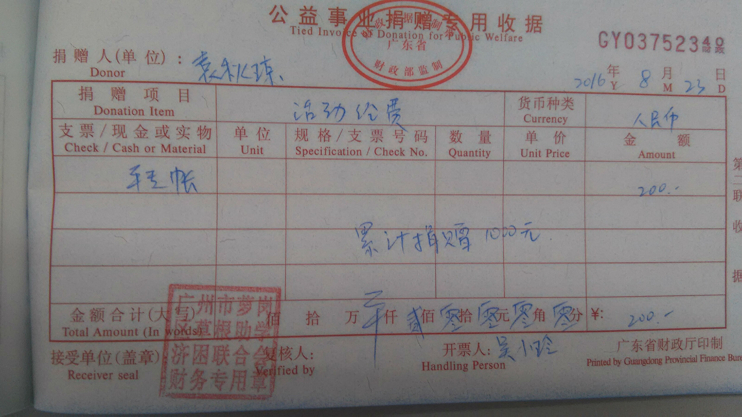 8月23日,广州爱心人士袁秋琼、张世涛分别捐赠草根助学会活动经费200元、100元,累计捐赠1000元、500元。感谢爱心人士的善举,好人一生平安。参与草根助学,请加QQ群83468190,或关注草根助学公众微信caogenzhuxue1,捐赠求助热线13794378327,QQ3245047171