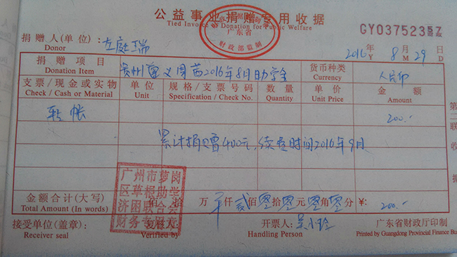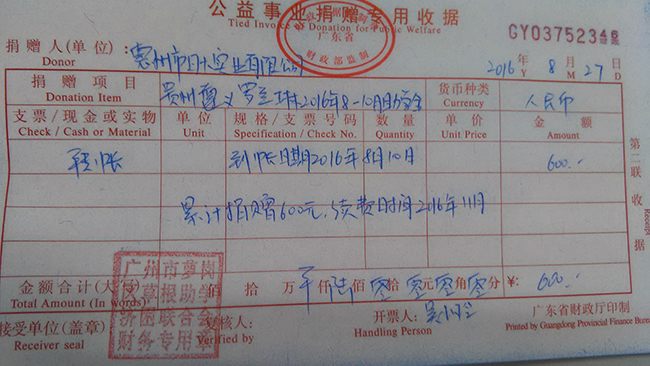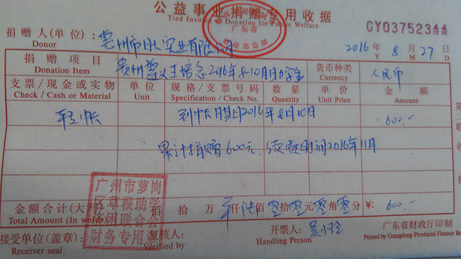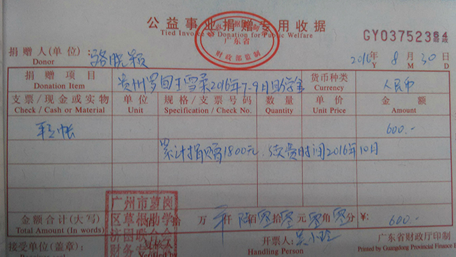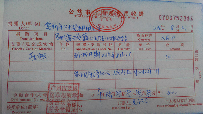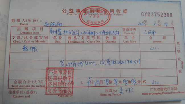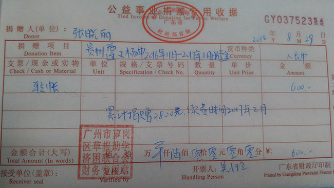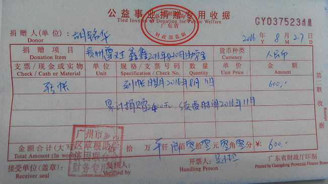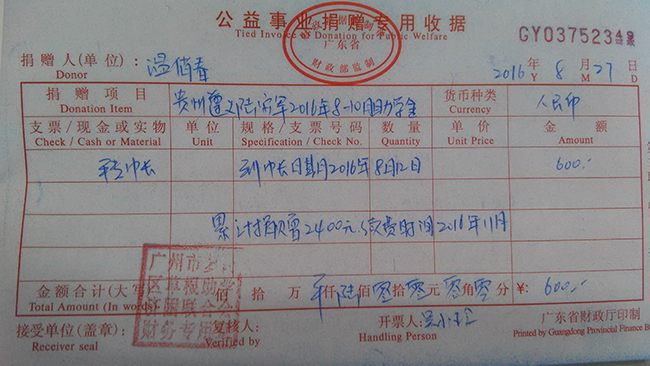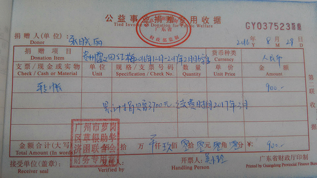 渴望求学的眼神让人心碎,热诚助学的精神让人感动。2016年8月10日-30日,爱心企业惠州日大实业有限公司分别捐赠贵州遵义陈琪琪、王培念、饶家弘、罗兰琳、黄露同学2016年8-10月助学金600元,累计捐赠600元、 600元、600元、600元、600元;爱心人士彭凌薇、胡铭华、温俏春分别捐赠贵州遵义宾祥慎、王鑫鑫、陆安军同学2016年8-10月助学金600元,累计捐赠2500元、2400元、2400元;爱心人士左庭瑞捐赠贵州遵义周茜同学2016年8月助学金200元,累计捐赠400元;爱心人士张晓丽分别捐赠贵州遵义杨选宇、田红梅同学2016年12月-2017年2月助学金600元、900元,捐赠贵州遵义杨申同学2016年11月-2017年1月助学金600元,累计捐赠3100元、3700元、2800元;爱心人士骆晓颖捐赠贵州罗甸王雪柔同学2016年7月-9月助学金600元,累计捐赠1800元。感谢爱心人士的善举,好人一生平安。参与草根助学,请加QQ群83468190,或关注草根助学公众微信caogenzhuxue,捐赠求助热线13794378327,QQ3245047171