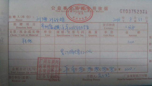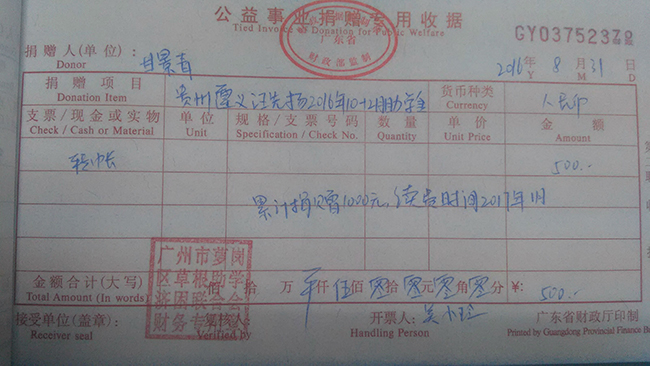 渴望求学的眼神让人心碎,热诚助学的精神让人感动。2016年8月19日,爱心人士甘景青捐赠贵州遵义汪先扬同学2016年10-12月助学金500元,累计捐赠1000元;8月28日,爱心人士刘珊、刘战雄捐赠贵州遵义周洋洋同学2016年助学金1000元,累计捐赠6200元。感谢爱心人士的善举,好人一生平安。参与草根助学,请加QQ群83468190,或关注草根助学公众微信caogenzhuxue, 捐赠求助热线13794378327,QQ3245047171