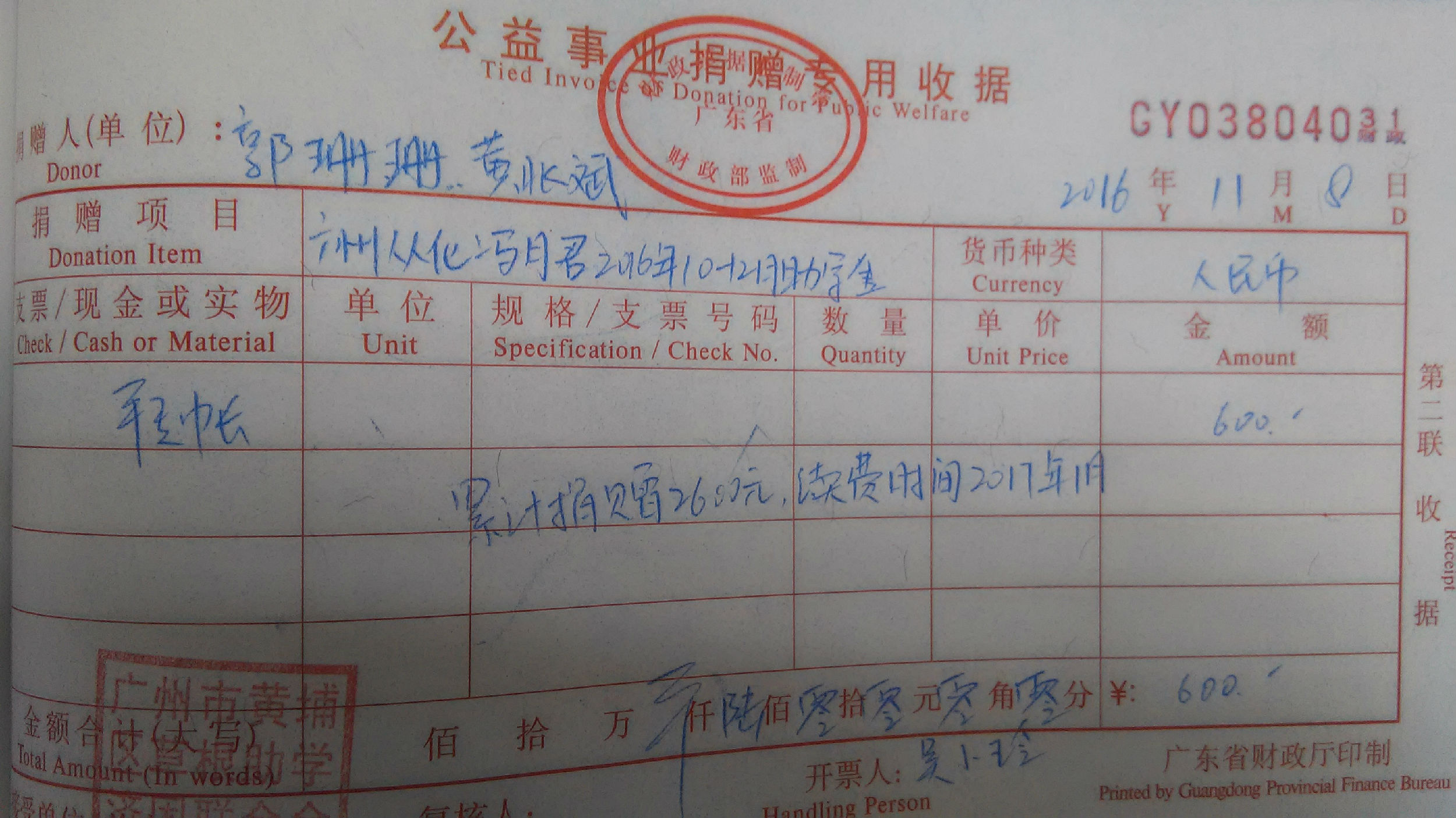 渴望求学的眼神让人心碎,热诚助学的精神让人感动。2016年11月8日,爱心人士郭珊珊、黄兆斌捐赠广州从化冯月君同学2016年10月-12月助学金600元,累计捐赠2600元,感谢爱心人士的善举,好人一生平安。参与草根助学,请加QQ群83468190,或关注草根助学公众微信caogenzhuxue, 捐赠求助热线13794378327,QQ3245047171