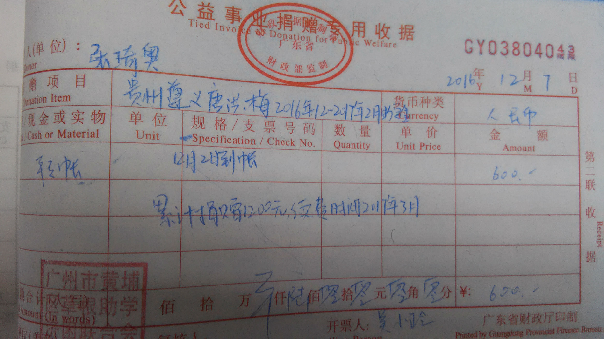 渴望求学的眼神让人心碎,热诚助学的精神让人感动。2016年12月7日,爱心人士张琦奥女士捐赠捐赠贵州遵义唐洪梅同学2016年12-2017年2月助学金600元,累计捐赠1200元,感谢爱心人士的善举,好人一生平安。参与草根助学,请加QQ群83468190,或关注草根助学公众微信caogenzhuxue, 捐赠求助热线13794378327,QQ3245047171