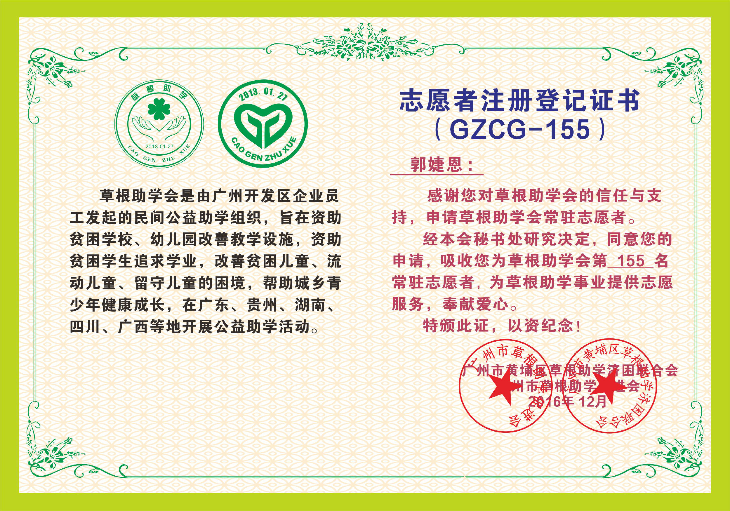 热烈欢迎来自星海音乐学院附中的郭婕恩同学以及黄埔区的缪文欢女士加入草根助学会,成为第155、156名常驻志愿者。 截止2016年12月20日,草根助学会常驻志愿者共156人,了解草根助学会,请链接www.caogenzhuxue.com