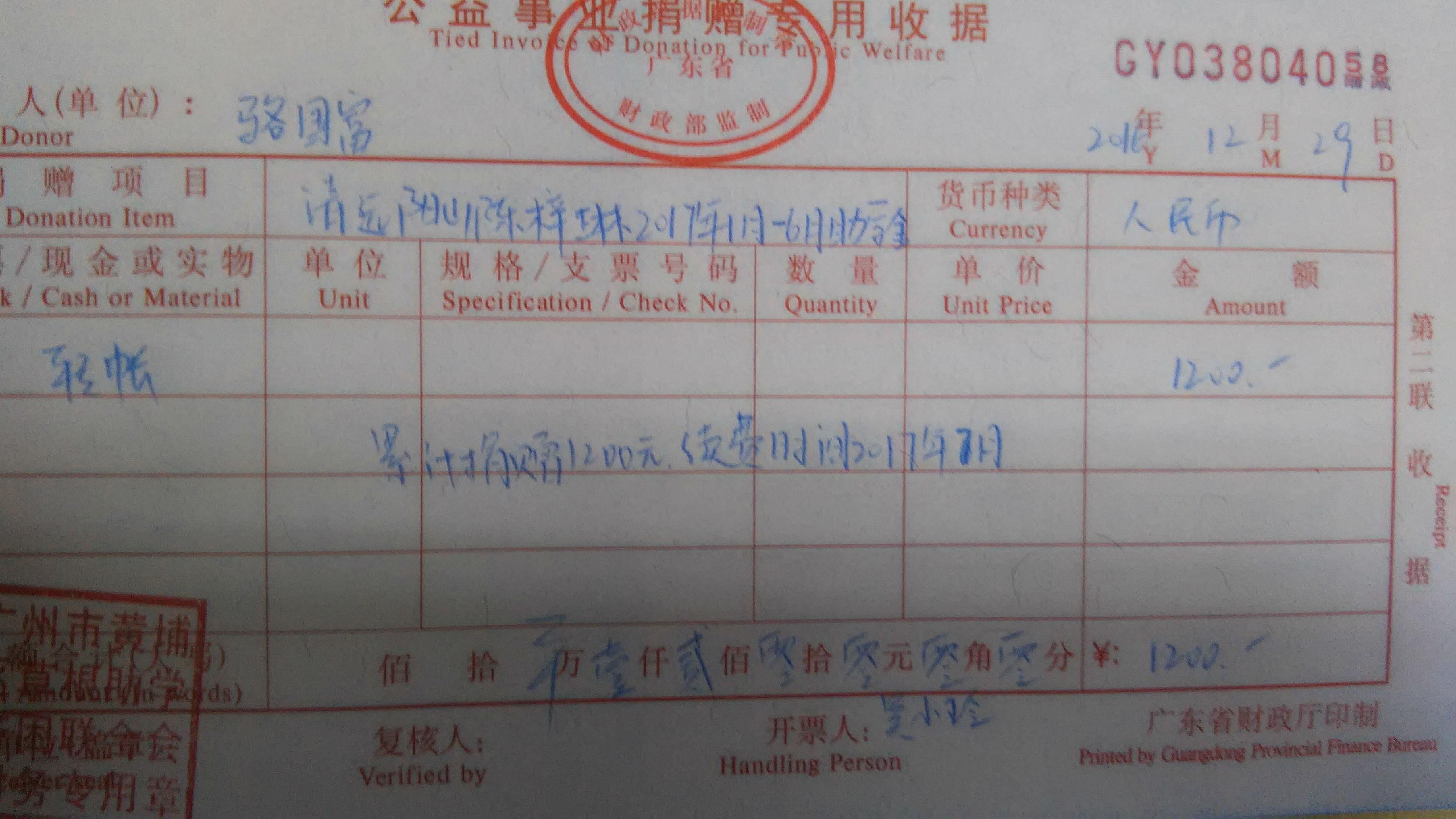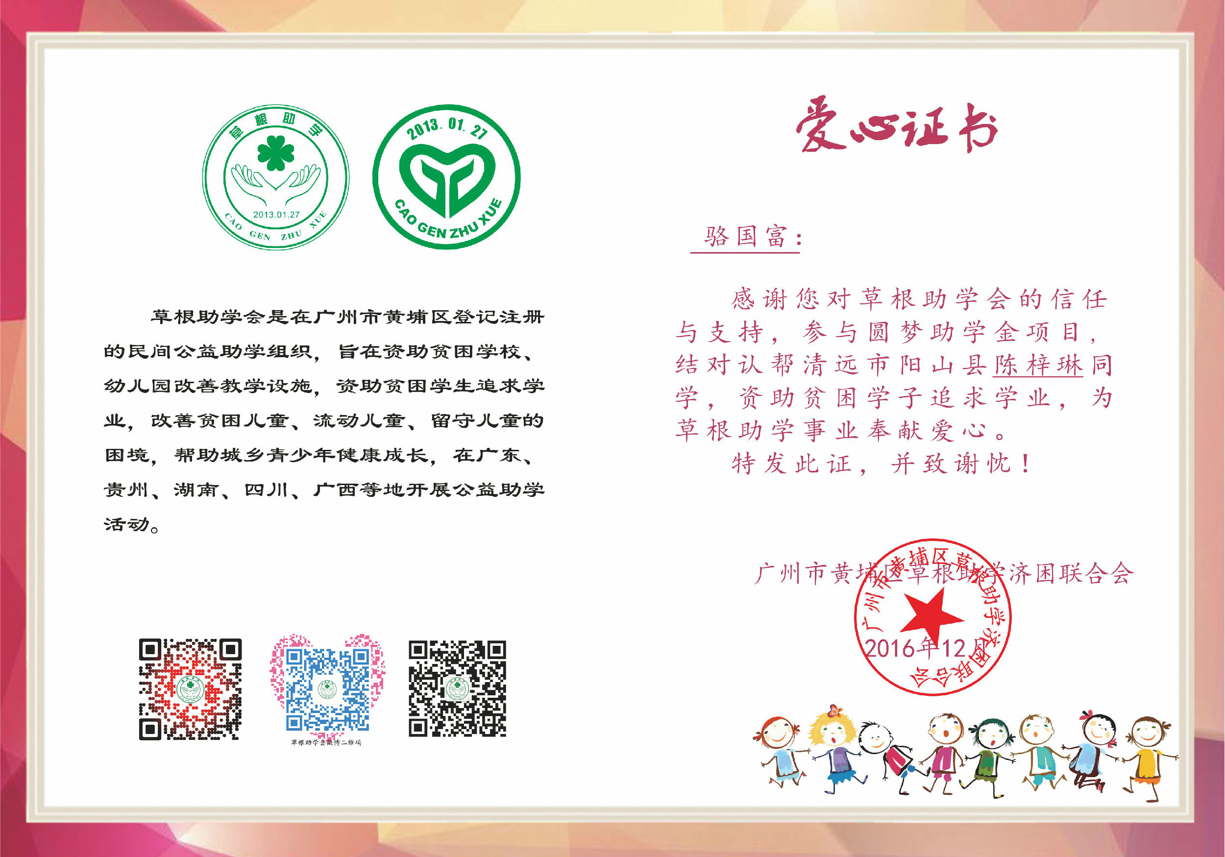 渴望求学的眼神让人心碎,热诚助学的精神让人感动。2016年12月29日,爱心人士骆国富先生结对认帮清远市阳山县陈梓林同学,捐赠2017年1月-6月助学金1200元,并向草根助学会捐赠工作经费130元。感谢爱心人士的善举,好人一生平安。参与草根助学,请加QQ群83468190,或关注草根助学公众微信caogenzhuxue,捐赠求助热线13794378327、13511883382,QQ3245047171