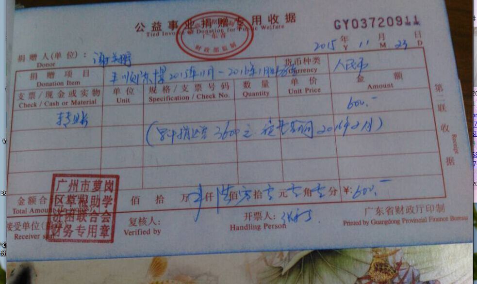 渴望求学的眼神让人心碎,热诚助学的精神让人感动。2015年11月23日,深圳爱心人士谢翔宇捐赠丰顺陈憬助学金600元,感谢爱心人士的善举,好人一生平安。参与草根助学,请加QQ群83468190,或关注草根助学公众微信caogenzhuxue1,网站 http://www.caogenzhuxue.com .捐赠求助热线137 9437 8327,QQ3245047171