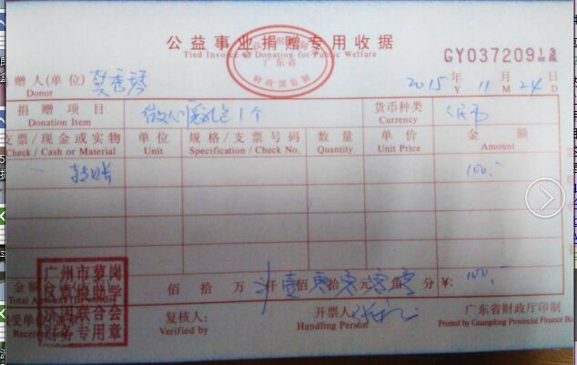 11月24日,广州爱心人士龚秀琴女士捐赠微心愿礼包1个(费用100元),这是草根助学会、广州市番禺区大夫山南门志愿驿站于11月24日发布“爱心圆梦贫困儿童微心愿”倡议书以来,收到的第1个微心愿礼包。
