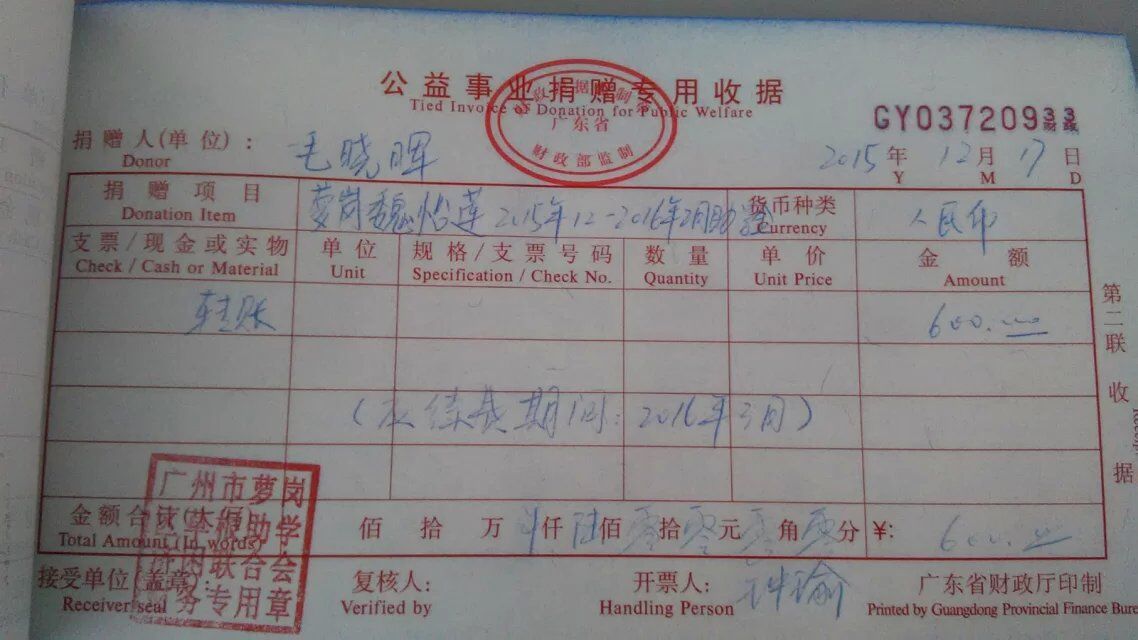 2015年12月17日,爱心人士毛晓晖捐赠广州萝岗魏怡莲同学2015年12月至2016年2月助学金600元。感谢爱心人士的善举,好人一生平安!该助学金将于2016年1月送达受助学生。