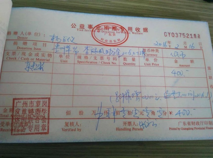 2016年2月12日,爱心人士杨子仪捐赠贵州毕节李禄凤同学2015年11-12月助学金400元,已累计捐赠2200元,草根助学会将于节假日后拨付。感谢爱心人士的善举,好人一生平安。