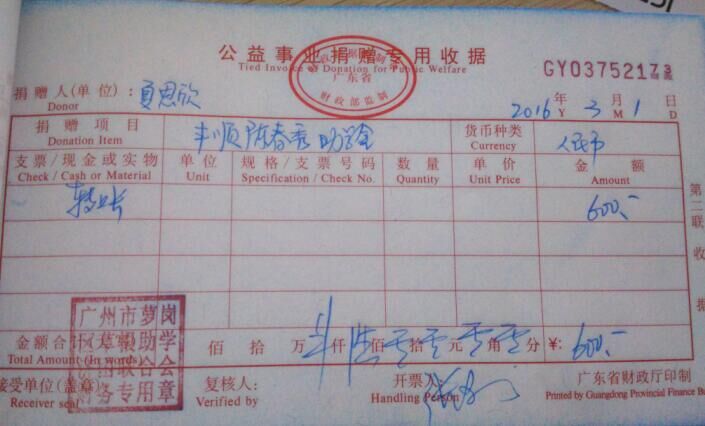2016年3月1日,爱心人士夏思欣捐赠梅州丰顺陈春秀同学2016年3-5月助学金600元,捐赠票据号:GY03752173,感谢爱心人士的善举,好人一生平安。参与草根助学,请加QQ群83468190,或关注草根助学公众微信caogenzhuxue1,网站
