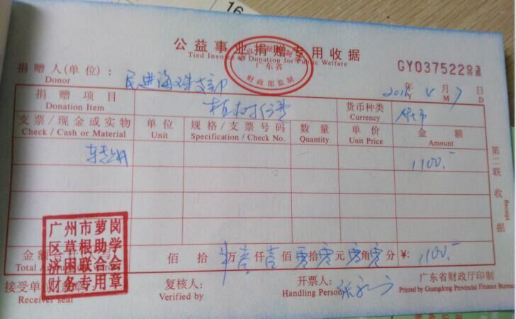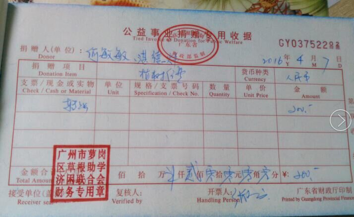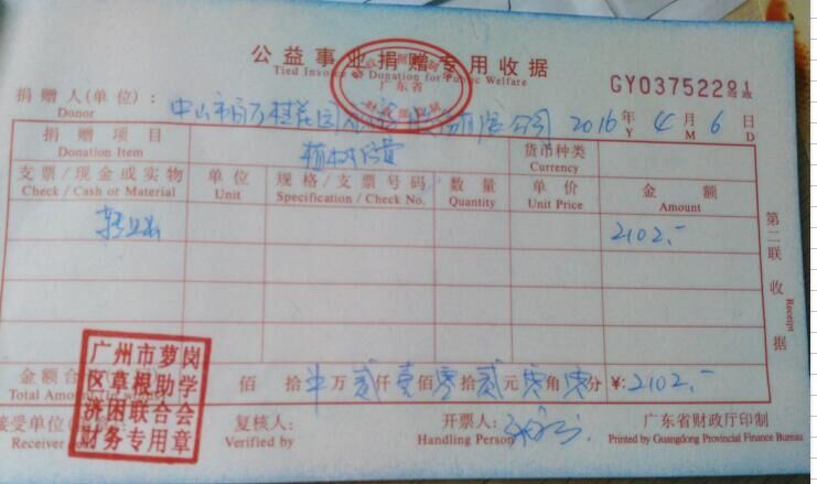 4月6日,中山百万桂花园捐赠植树活动经费2102元,捐赠票据:GY03752201;4月7日爱心人士何敏敏、湛德炜捐赠植树经费200元,捐赠票据:GY03752202;民进海珠支部捐赠植树活动经费1100元,捐赠票据:GY03752203;共捐赠3402元,感谢爱心企业和爱心人士的善举,好人一生平安。参与草根助学,请加QQ群83468190,或关注草根助学公众微信caogenzhuxue1,网站http://www.caogenzhuxue.com,捐赠求助热线13794378327,QQ3245047171