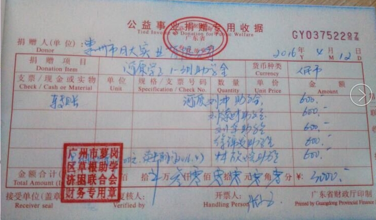 2016年4月14日,爱心企业惠州市日大实业有限公司捐赠河源刘冲,刘德财,刘华,徐锦发,林欣瑶五位同学2016年第一季度助学金共3000元,累计捐赠27000元,捐赠票据号:GY03752207。感谢爱心企业的善举,好人一生平安。参与草根助学,请加QQ群83468190,或关注草根助学公众微信caogenzhuxue1,网站 http://www.caogenzhuxue.com .捐赠求助热线137 9437 8327, QQ3245047171