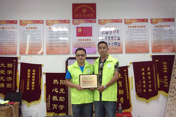 20150829草根助学会理事刘勇彬向罗甸县草根助学会代表颁授公益助学铭牌