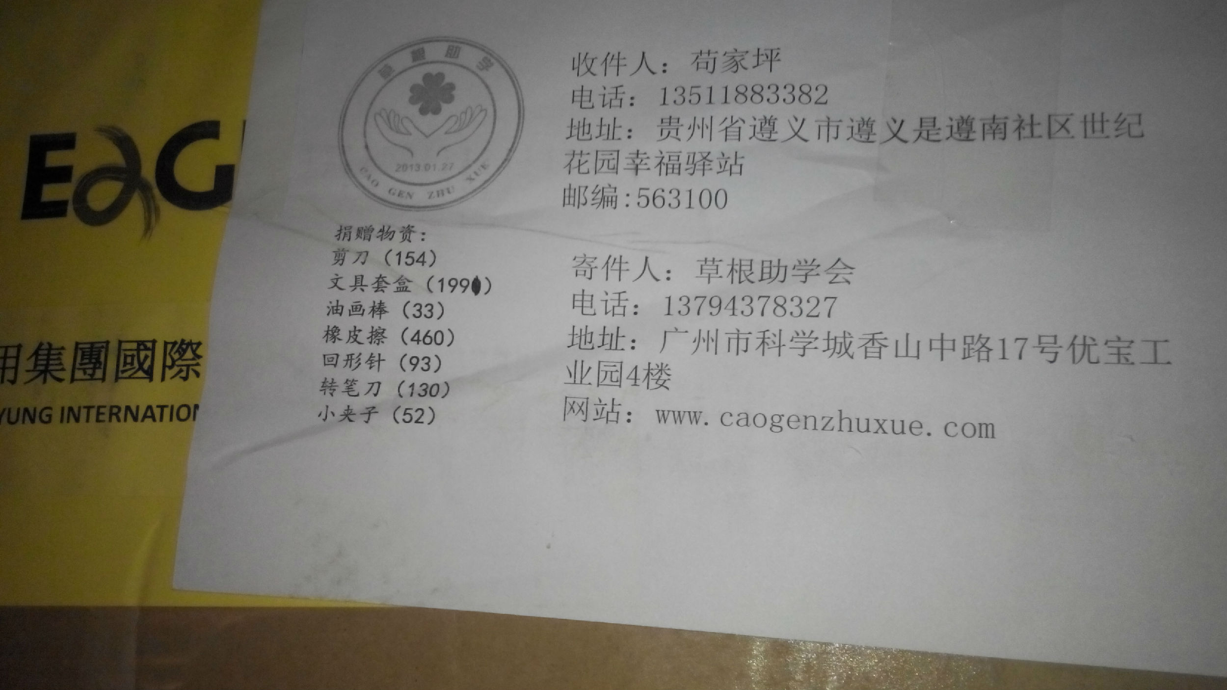 昨日,接到广州草根伙伴赠送给遵义县草根助学会的物资已在遵义后。本会理事会成员主动申请。今日已将物资运到了草根办公室。感谢理事苏小松的参与。三箱货物沉重。苏小松自驾车到三十多里的遵义。将物资搬上搬下。直到下午才将物资运到了办公室。他的此种善举。休现了遵义草根助学的公益之心。助学不图名利。有的只是付出。从理事苏小松身上折射出了遵义草根的助学精神。一切以奉献为主。值得欣慰的是能看到孩子们欢快的笑容。现持物资公示。以作明年开学之用。