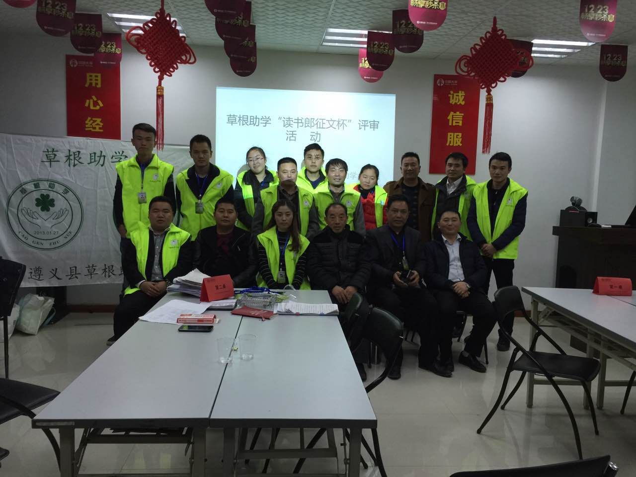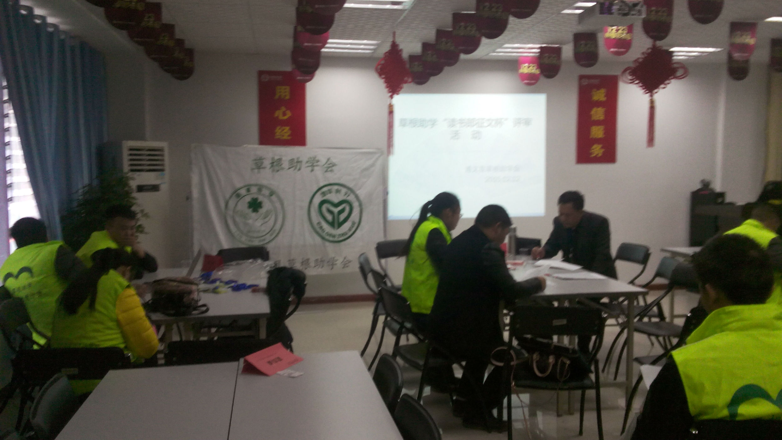 2015年12月12日,遵义县草根助学会组织部分教师及志愿者20余人在理事曾贵阳经理(太平保险公司会议室)开展了“读书朗杯征文”活动评审,参加此次有遵义县著名诗人谢宗山老师,遵义县教育局党陈金太同志,遵义国际商贸城会长向才安先生以及本会成员及志愿者;12点,各理事及志愿者都准时到入会场。评审之前,本会召开了遵义县草根助学会第二次会议,会议谈及了草根助学的宗旨及助学理念,在会议中,理事向才安先生向遵义县草根助学会捐赠了500元,表明作遵义县草根助学会活动之用。理事付国带来了本会理事秦开均捐赠1000元作遵义县草根助学会印刷“征文杯”一书费用,会长谈明了本次评审的要求后,各教师及志愿主动承担,认真评选,通过3个多小时的评审,共122篇学生征文,评选出70篇作文,一等奖10名,二等奖15名,三等奖20名,优秀奖25名,有关打印70篇征文稿,秘书长刘娇主动承担了近40篇作文,副秘书长贺心灵主动拿10篇打印,理事陈金太都主动拿5篇作文打印,其余志愿者纷纷拿去学生获奖作文打印。各志愿者合了影。著名诗人谢宗山老师评价草根助学会说,遵义县草根助学会是一支团结、上进的公益队伍,他表示将他的杰作作为读书朗杯作文的开头篇。以下是活动图片