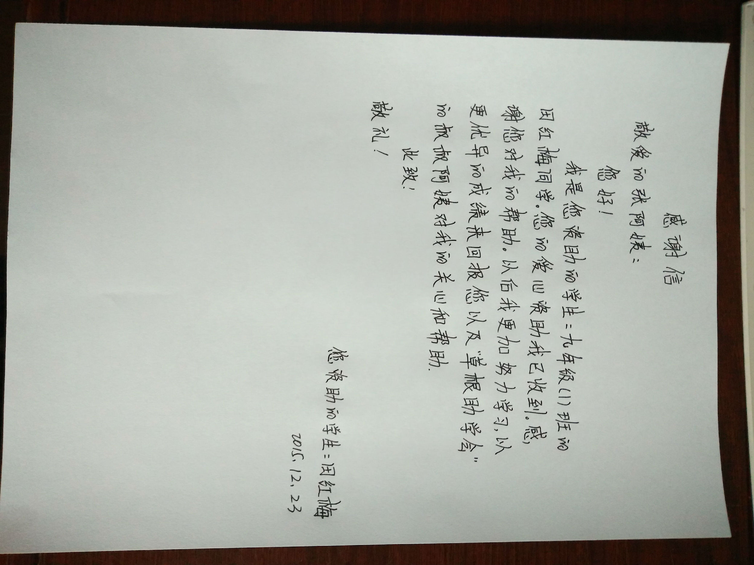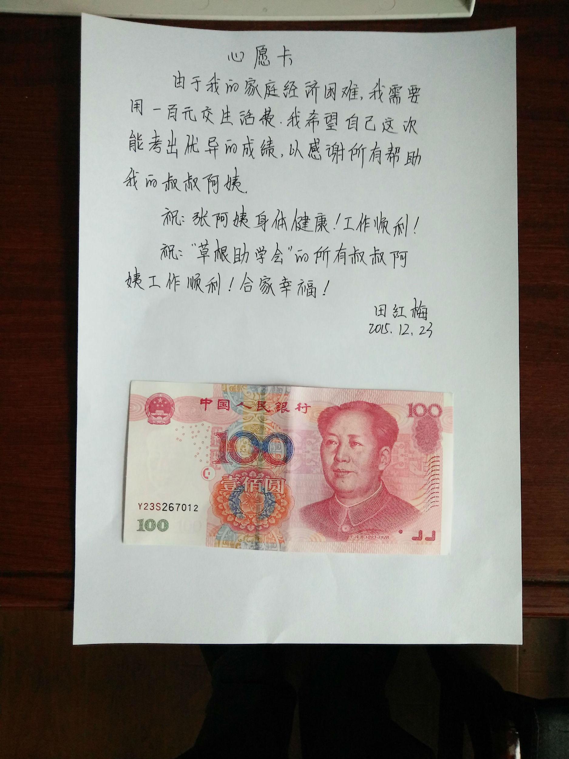 感谢广州张晓丽女士昨晚认帮了铁厂镇中学田红梅和铁厂小学杨选宇同学,并打款到广州公益账户2600元,分别给这两位品学兼优的贫困学子打款助学金6个月共计2400元,并给两个孩子微心愿各100元作学生的圣诞节特别之物之用,现已由一线志愿者赵太义主任交到受助学生手中。铁厂小学谢校长还在整理中,感谢张晓丽女士的善举,草根助学情,处处显真情